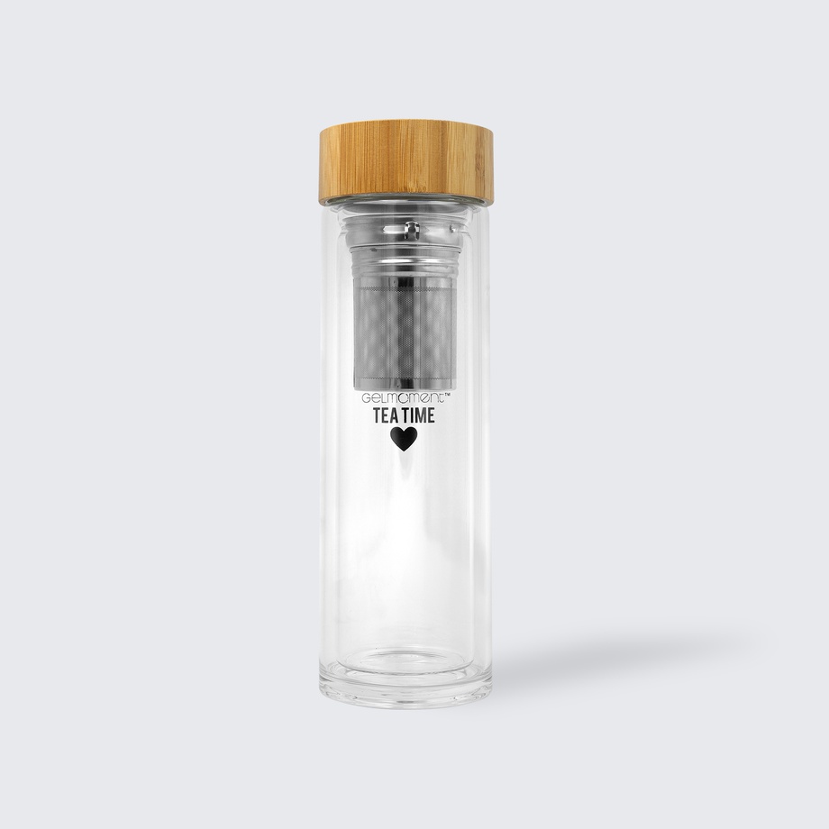 Enjoy your favourite GelMoment tea at home or on the go! This elegant double walled glass bottle with infuser will keep your drink hot or cold for up to 8 hours.